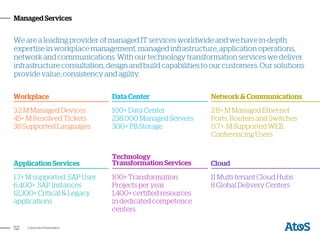 Atos IT Solutions Services supports 20 business functions and 1000 processes by providing end-to. The remit covers the full. European number one in cybersecurity cloud and high performance computing the Group provides tailored end-to-end solutions for all industries in 71 countries.